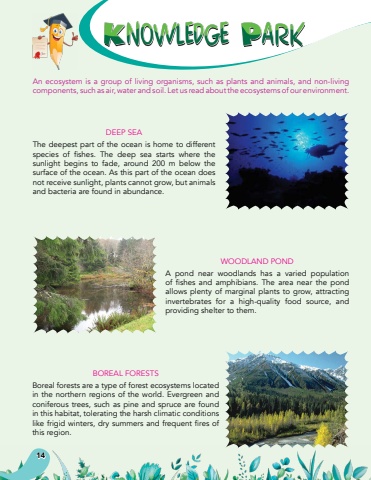 14DEEP SEAThe deepest part of the ocean is home to different speciesoffishes.Thedeepseastartswherethesunlight begins to fade, around 200 m below the surface of the ocean. As this part of the ocean does not receive sunlight, plants cannot grow, but animals and bacteria are found in abundance. WOODLAND PONDA pond near woodlands has a varied population offishesandamphibians.Theareanearthepondallows plenty of marginal plants to grow, attracting invertebrates for a high-quality food source, and providing shelter to them.BOREAL FORESTSBoreal forests are a type of forest ecosystems located in the northern regions of the world. Evergreen and coniferous trees, such as pine and spruce are found in this habitat, tolerating the harsh climatic conditions likefrigidwinters,drysummersandfrequentfiresofthis region.An ecosystem is a group of living organisms, such as plants and animals, and non-living components, such as air, water and soil. Let us read about the ecosystems of our environment.