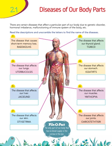321357246821Diseases of Our Body PartsThere are certain diseases that affect a particular part of our body due to genetic disorder, hormonal imbalance, malfunctioning of immune system of the body, etc.Read the descriptions and unscramble the letters to find the name of the diseases.The only part of our body that has no blood supply is the cornea in the eye.File-O-FactThe disease that causes short-term memory loss.RAEEMZLHISThe disease that affects our thyroid gland.TGREOIThe disease that affects our skin.DTIISETRMAThe disease that affects our stomach.IGSATIRTSThe disease that affects our joints.OAROSTETHTISRIThe disease that affects our lungs.UTERBUCOLSISThe disease that affects our liver.JACIEUNDThe disease that affects our muscles.YMTHOPYA