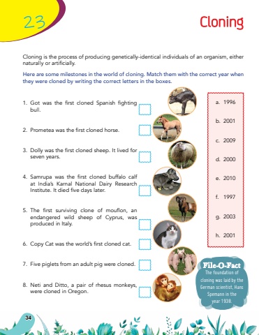 3423Cloning Cloning is the process of producing genetically-identical individuals of an organism, either naturallyorartificially.Here are some milestones in the world of cloning. Match them with the correct year when they were cloned by writing the correct letters in the boxes.1.%u0009 GotwasthefirstclonedSpanishfightingbull.2.%u0009 Prometeawasthefirstclonedhorse.3.%u0009 Dollywasthefirstclonedsheep.Itlivedforseven years.4.%u0009 Samrupawasthefirstclonedbuffalocalfat India%u2019s Karnal National Dairy Research Institute.Itdiedfivedayslater.5.%u0009 Thefirstsurvivingcloneofmouflon,anendangered wild sheep of Cyprus, was produced in Italy.6.%u0009 CopyCatwastheworld%u2019sfirstclonedcat.7.Five piglets from an adult pig were cloned.8.Neti and Ditto, a pair of rhesus monkeys, were cloned in Oregon.The foundation of cloning was laid by the German scientist, Hans Spemann in the year 1938.File-O-Facta.1996b.2001c.2009d.2000e.2010f.1997g.2003h.2001