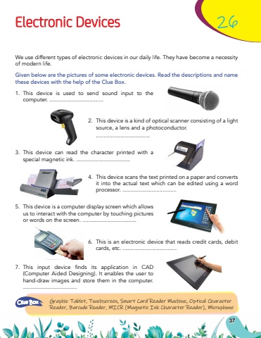 37Electronic Devices26We use different types of electronic devices in our daily life. They have become a necessity of modern life.Given below are the pictures of some electronic devices. Read the descriptions and name these devices with the help of the Clue Box.1.This device is used to send sound input to the computer. ...................................2.This device is a kind of optical scanner consisting of a light source, a lens and a photoconductor....................................3.This device can read the character printed with a special magnetic ink. ...................................4.This device scans the text printed on a paper and converts it into the actual text which can be edited using a word processor. ...................................5.This device is a computer display screen which allows us to interact with the computer by touching pictures or words on the screen. ...................................7.%u0009 ThisinputdevicefindsitsapplicationinCAD(Computer Aided Designing). It enables the user to hand-draw images and store them in the computer. ...................................6.This is an electronic device that reads credit cards, debit cards, etc. ...................................Graphic Tablet, Touchscreen, Smart Card Reader Machine, Optical Character Reader, Barcode Reader, MICR (Magnetic Ink Character Reader), MicrophoneClue Box