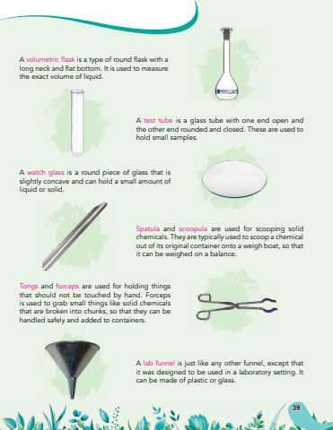 39A volumetricflaskisatypeofroundflaskwithalongneckandflatbottom.Itisusedtomeasurethe exact volume of liquid.A watch glass is a round piece of glass that is slightly concave and can hold a small amount of liquid or solid.Tongs and forceps are used for holding things that should not be touched by hand. Forceps is used to grab small things like solid chemicals that are broken into chunks, so that they can be handled safely and added to containers.A test tube is a glass tube with one end open and the other end rounded and closed. These are used to hold small samples.Spatula and scoopula are used for scooping solid chemicals. They are typically used to scoop a chemical out of its original container onto a weigh boat, so that it can be weighed on a balance.A lab funnel is just like any other funnel, except that it was designed to be used in a laboratory setting. It can be made of plastic or glass.