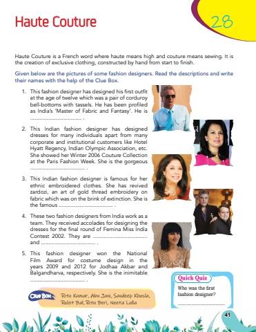 41Haute Couture28Haute Couture is a French word where haute means high and couture means sewing. It is thecreationofexclusiveclothing,constructedbyhandfromstarttofinish.Given below are the pictures of some fashion designers. Read the descriptions and write their names with the help of the Clue Box.Ritu Kumar, Abu Jani, Sandeep Khosla, Rohit Bal, Ritu Beri, Neeta LullaClue Box%u0009 1.%u0009 Thisfashiondesignerhasdesignedhisfirstoutfitat the age of twelve which was a pair of corduroy bell-bottomswithtassels.Hehasbeenprofiledas India%u2019s %u2018Master of Fabric and Fantasy%u2019. He is .................................. .2.This Indian fashion designer has designed dresses for many individuals apart from many corporate and institutional customers like Hotel Hyatt Regency, Indian Olympic Association, etc. She showed her Winter 2006 Couture Collection at the Paris Fashion Week. She is the gorgeous .................................... .3.This Indian fashion designer is famous for her ethnic embroidered clothes. She has revived zardozi, an art of gold thread embroidery on fabric which was on the brink of extinction. She is the famous .................................... .4.These two fashion designers from India work as a team. They received accolades for designing the dressesforthefinalroundofFeminaMissIndiaContest 2002. They are .................................... and .................................... .5.This fashion designer won the National Film Award for costume design in the years 2009 and 2012 for Jodhaa Akbar and Balgandharva, respectively. She is the inimitable .................................... .Who was the first fashion designer?......................................