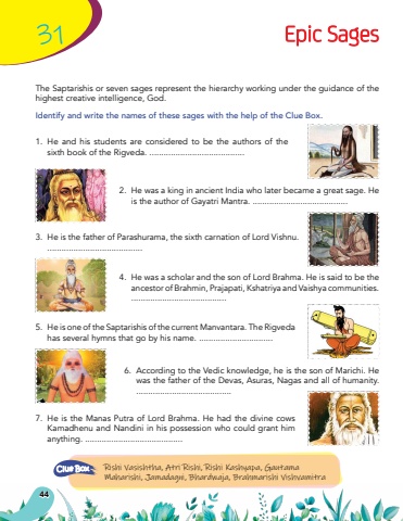 4431Epic SagesThe Saptarishis or seven sages represent the hierarchy working under the guidance of the highest creative intelligence, God.Identify and write the names of these sages with the help of the Clue Box.1.He and his students are considered to be the authors of the sixth book of the Rigveda. ........................................2.He was a king in ancient India who later became a great sage. He is the author of Gayatri Mantra. ........................................3.He is the father of Parashurama, the sixth carnation of Lord Vishnu. ........................................4.He was a scholar and the son of Lord Brahma. He is said to be the ancestor of Brahmin, Prajapati, Kshatriya and Vaishya communities. ........................................6.According to the Vedic knowledge, he is the son of Marichi. He was the father of the Devas, Asuras, Nagas and all of humanity. ........................................7.He is the Manas Putra of Lord Brahma. He had the divine cows Kamadhenu and Nandini in his possession who could grant him anything. .........................................Rishi Vasishtha, Atri Rishi, Rishi Kashyapa, Gautama Maharishi, Jamadagni, Bhardwaja, Brahmarishi VishvamitraClue Box5.He is one of the Saptarishis of the current Manvantara. The Rigveda has several hymns that go by his name. ...............................