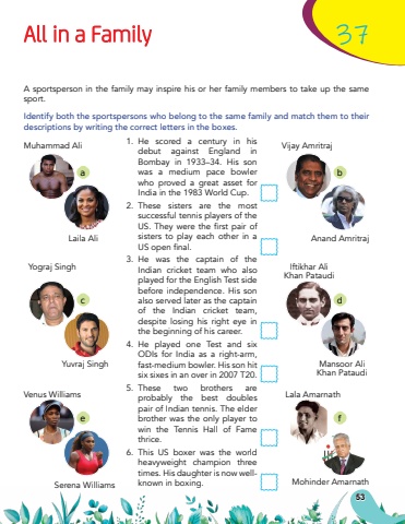 53All in a Family37A sportsperson in the family may inspire his or her family members to take up the same sport.Identify both the sportspersons who belong to the same family and match them to their descriptions by writing the correct letters in the boxes.1.He scored a century in his debut against England in Bombay in 1933%u201334. His son was a medium pace bowler who proved a great asset for India in the 1983 World Cup.2.These sisters are the most successful tennis players of the US.Theywerethefirstpairofsisters to play each other in a USopenfinal.3.He was the captain of the Indian cricket team who also played for the English Test side before independence. His son also served later as the captain of the Indian cricket team, despite losing his right eye in the beginning of his career.4.He played one Test and six ODIs for India as a right-arm, fast-medium bowler. His son hit six sixes in an over in 2007 T20.5.These two brothers are probably the best doubles pair of Indian tennis. The elder brother was the only player to win the Tennis Hall of Fame thrice.6.This US boxer was the world heavyweight champion three times. His daughter is now wellknown in boxing.efcdabVenus Williams Lala AmarnathIftikhar Ali Khan PataudiYograj SinghMuhammad AliVijay AmritrajMohinder AmarnathSerena WilliamsMansoor Ali Khan PataudiYuvraj SinghLaila AliAnand Amritraj