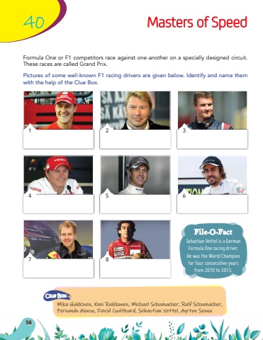 5640Masters of SpeedFormula One or F1 competitors race against one-another on a specially designed circuit. These races are called Grand Prix. Pictures of some well-known F1 racing drivers are given below. Identify and name them with the help of the Clue Box.Mika Hakkinen, Kimi Raikkonen, Michael Schumacher, Ralf Schumacher, Fernando Alonso, David Coulthard, Sebastian Vettel, Ayrton SennaClue BoxSebastian Vettel is a German Formula One racing driver. He was the World Champion for four consecutive years from 2010 to 2013.File-O-Fact14725836