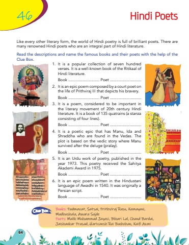6446Hindi PoetsLike every other literary form, the world of Hindi poetry is full of brilliant poets. There are many renowned Hindi poets who are an integral part of Hindi literature.Read the descriptions and name the famous books and their poets with the help of the Clue Box.1.It is a popular collection of seven hundred verses. It is a well-known book of the Ritikaal of Hindi literature.Book ............................ Poet ............................2.It is an epic poem composed by a court poet on the life of Prithviraj III that depicts his bravery.Book ............................ Poet ............................3.It is a poem, considered to be important in the literary movement of 20th century Hindi literature. It is a book of 135 quatrains (a stanza consisting of four lines).Book ............................ Poet ............................4.It is a poetic epic that has Manu, Ida and Shraddha who are found in the Vedas. The plot is based on the vedic story where Manu survived after the deluge (pralay).Book ............................ Poet ............................5.It is an Urdu work of poetry, published in the year 1973. This poetry received the Sahitya Akademi Award in 1975.Book ............................ Poet ............................6.It is an epic poem written in the Hindustani language of Awadhi in 1540. It was originally a Persian script.Book ............................ Poet ............................Books: Padmavat, Satsai, Prithviraj Raso, Kamayani, Madhushala, Awara SajdePoets: Malik Muhammad Jayasi, Bihari Lal, Chand Bardai, Jaishankar Prasad, Harivansh Rai Bachchan, Kaifi AzmiClue Box