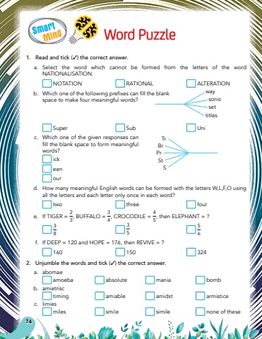SmartMind74Word Puzzle1.Read and tick (3) the correct answer.a.Select the word which cannot be formed from the letters of the word NATIONALISATION. NOTATION RATIONAL ALTERATION%u0009 b.%u0009 Whichoneofthefollowingprefixescanfilltheblankspace to make four meaningful words? Super Sub Unic.Which one of the given responses can filltheblankspacetoformmeaningfulwords? ick een ourd.How many meaningful English words can be formed with the letters W,L,F,O using all the letters and each letter only once in each word? two three foure.If TIGER = 23, BUFFALO = 34, CROCODILE = 45, then ELEPHANT = ?383556f.If DEEP = 120 and HOPE = 176, then REVIVE = ? 160 150 3242.Unjumble the words and tick (3) the correct answer.a.abomae amoeba absolute mania bombb.amietrisc timing amiable amidst armisticec.limies miles smile simile none of thesewaysonictitlessetBrPrTrStS
