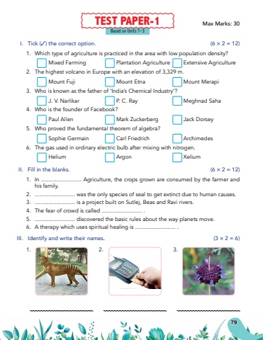 79Based on Units 1-3I.Tick (3) the correct option.(6 %u00d7 2 = 12)1.Which type of agriculture is practiced in the area with low population density?Mixed FarmingPlantation AgricultureExtensive Agriculture2.The highest volcano in Europe with an elevation of 3,329 m.Mount FujiMount EtnaMount Merapi3.Who is known as the father of %u2018India%u2019s Chemical Industry%u2019?J. V. NarlikarP. C. RayMeghnad Saha4.Who is the founder of Facebook?Paul AllenMark ZuckerbergJack Dorsey5.Who proved the fundamental theorem of algebra?Sophie GermainCarl FriedrichArchimedes6.The gas used in ordinary electric bulb after mixing with nitrogen.HeliumArgonXeliumII.Fill in the blanks.(6 %u00d7 2 = 12)1.In .......................... Agriculture, the crops grown are consumed by the farmer and his family.2........................... was the only species of seal to get extinct due to human causes.3........................... is a project built on Sutlej, Beas and Ravi rivers.4.The fear of crowd is called .......................... .5........................... discovered the basic rules about the way planets move.6.A therapy which uses spiritual healing is .......................... .III.Identify and write their names.(3 %u00d7 2 = 6)1.2.3.TEST PAPER-1Max Marks: 30