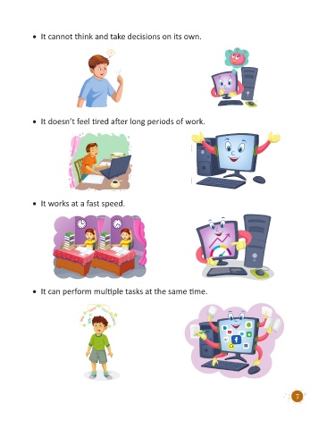 • It cannot think and take decisions on its own. • It doesn’t feel tired after long periods of work. • It works at a fast speed. • It can perform multiple tasks at the same time. 7