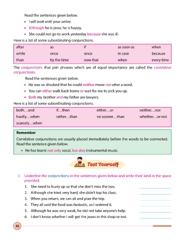 I. Underline the conjunctions in the sentences given below and write their kind in the space