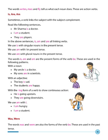 The words writes, rises and fly tell us what each noun does. These are action verbs.