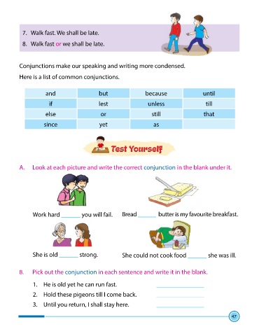 A. Look at each picture and write the correct conjunction in the blank under it.