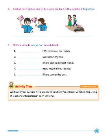 B. Look at each picture and write a sentence for it with a suitable interjection.
