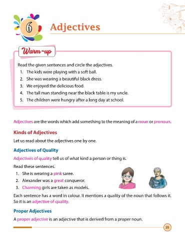 Each sentence has a word in colour. It mentions a quality of the noun that follows it.