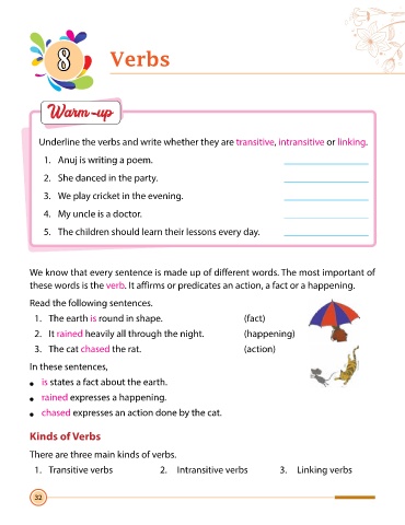Underline the verbs and write whether they are transitive, intransitive or linking.