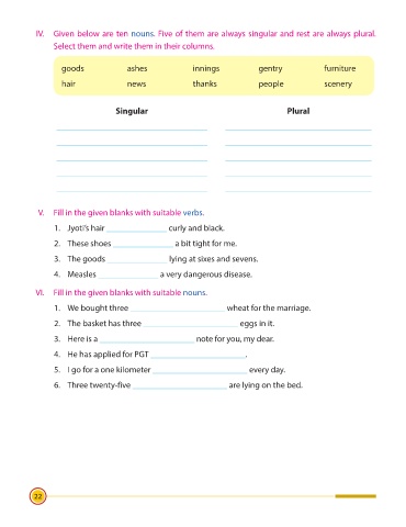 IV. Given below are ten nouns. Five of them are always singular and rest are always plural.