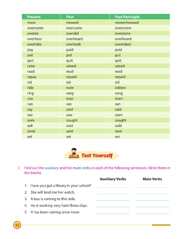 I. Find out the auxiliary and the main verbs in each of the following sentences. Write them in