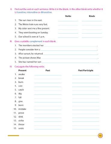 II. Find out the verb in each sentence. Write it in the blank. In the other blank write whether it
