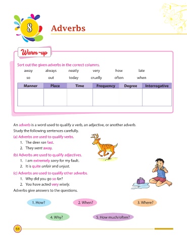 An adverb is a word used to qualify a verb, an adjective, or another adverb.
