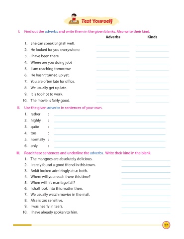 I. Find out the adverbs and write them in the given blanks. Also write their kind.