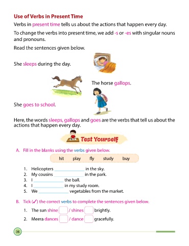 Here, the words sleeps, gallops and goes are the verbs that tell us about the