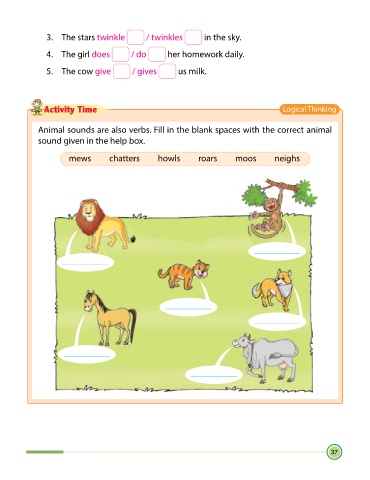 Animal sounds are also verbs. Fill in the blank spaces with the correct animal