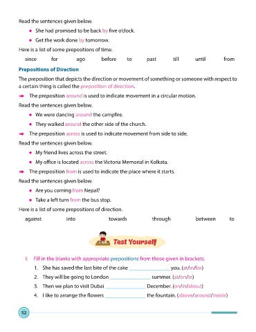 I. Fill in the blanks with appropriate prepositions from those given in brackets.