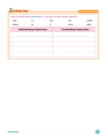 Activity Time Analytical Thinking Here is a list of some conjunctions. Sort them in their correct columns. and or but yet while when so if since after Subordinating Conjunctions Coordinating Conjunctions 5757