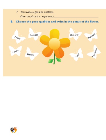 7. You made a genuine mistake. (Say sorry/start an argument) ____________________________ B. Choose the good qualities and write in the petals of the flower. Punctual Respect Honesty Angry Loving Discipline Lazy Hateful 24
