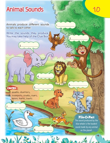 15Clue Boxquacks, chatters, trumpets, croaks, roars, mews, barks, hoots10The sound produced by the blue whale is the loudest sound made by any animal on the planet.File-O-FactAnimal SoundsAnimals produce different sounds to talk to each other.Write the sounds they produce. You may take help of the Clue Box.1.......................2.......................4...................3.......................6.......................8.......................7.......................5.......................