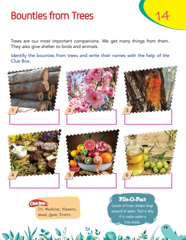 19Bounties from Trees14Leaves of trees release large amount of water. That is why it is cooler under a tree shade.File-O-FactOil, Medicine, Flowers, Wood, Gum, FruitsClue BoxTrees are our most important companions. We get many things from them. They also give shelter to birds and animals.Identify the bounties from trees and write their names with the help of the Clue Box.142536