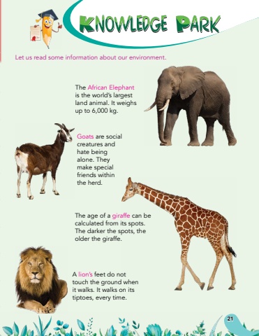 21Let us read some information about our environment.The African Elephantis the world%u2019s largest land animal. It weighs up to 6,000 kg.Goats are social creatures and hate being alone. They make special friends within the herd.A lion%u2019s feet do not touch the ground when it walks. It walks on its tiptoes, every time.The age of a giraffe can be calculated from its spots. The darker the spots, the older the giraffe.