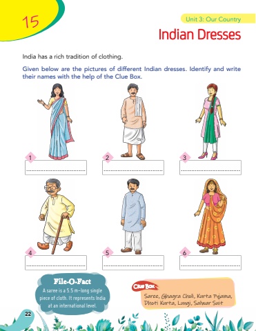 22India has a rich tradition of clothing.Given below are the pictures of different Indian dresses. Identify and write their names with the help of the Clue Box.Indian DressesUnit 3: Our Country15A saree is a 5.5 m-long single piece of cloth. It represents India at an international level.File-O-FactSaree, Ghagra Choli, Kurta Pyjama, Dhoti Kurta, Lungi, Salwar SuitClue Box............................................................................................................................................................................................................142536