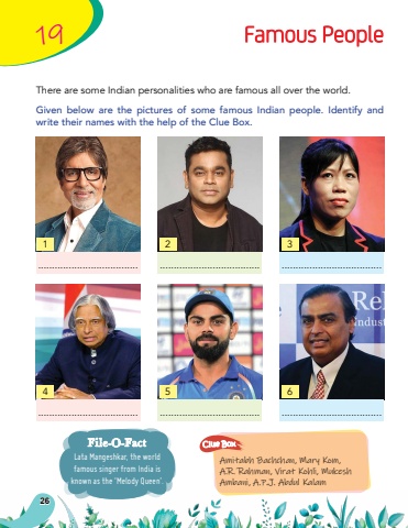 2619Famous PeopleLata Mangeshkar, the world famous singer from India is known as the %u2018Melody Queen%u2019.File-O-FactAmitabh Bachchan, Mary Kom, A.R. Rahman, Virat Kohli, Mukesh Ambani, A.P.J. Abdul KalamClue BoxThere are some Indian personalities who are famous all over the world.Given below are the pictures of some famous Indian people. Identify and write their names with the help of the Clue Box.........................................................................................................................................................................................................................142536