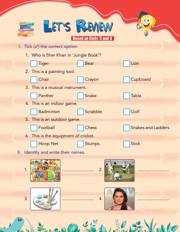 50I.Tick (3) the correct option.1.Who is Sher Khan in %u2018Jungle Book%u2019?TigerBearLion2.This is a painting tool.ChairCrayonCupboard3.This is a musical instrument.PantherSnakeTabla4.This is an indoor game.BadmintonScrabbleGolf5.This is an outdoor game.FootballChessSnakes and Ladders6.This is the equipment of cricket.Hoop NetStumpsStickII.Identify and write their names.1...........................2...........................3...........................4...........................Based on Units 5 and 6