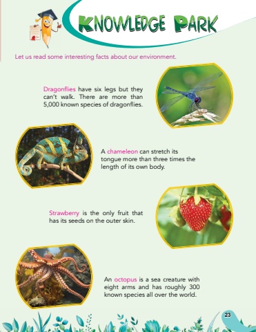 23Let us read some interesting facts about our environment.Dragonflies have six legs but they can%u2019t walk. There are more than 5,000 known species of dragonflies.Strawberry is the only fruit that has its seeds on the outer skin.An octopus is a sea creature with eight arms and has roughly 300 known species all over the world.A chameleon can stretch its tongue more than three times the length of its own body.