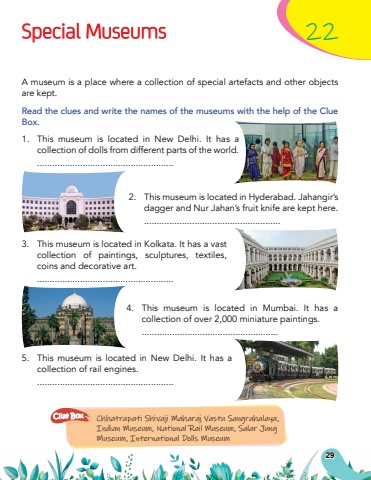29A museum is a place where a collection of special artefacts and other objects are kept.Read the clues and write the names of the museums with the help of the Clue Box.1.This museum is located in New Delhi. It has a collection of dolls from different parts of the world.......................................................2.This museum is located in Hyderabad. Jahangir%u2019s dagger and Nur Jahan%u2019s fruit knife are kept here.......................................................3.This museum is located in Kolkata. It has a vast collection of paintings, sculptures, textiles, coins and decorative art.......................................................4.This museum is located in Mumbai. It has a collection of over 2,000 miniature paintings.......................................................5.This museum is located in New Delhi. It has a collection of rail engines.......................................................Special Museums22Chhatrapati Shivaji Maharaj Vastu Sangrahalaya, Indian Museum, National Rail Museum, Salar Jung Museum, International Dolls MuseumClue Box