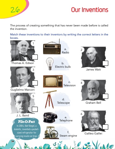 34Thomas A. EdisonGuglielmo MarconiJ. L. BairdJames WattGraham BellGalileo Galilei26Our InventionsThe process of creating something that has never been made before is called the invention.Match these inventions to their inventors by writing the correct letters in the boxes.a. Radiob. Electric bulbd. Telescopee. Telephonef. Steam enginec. TelevisionIn 2004, Olaf Diegel, a diabetic, invented a pocketsized refrigerator for carrying insulin on trips.File-O-Fact124635