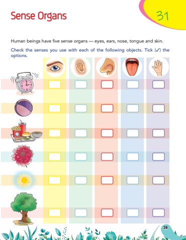 39Sense OrgansHuman beings have five sense organs %u2014 eyes, ears, nose, tongue and skin.Check the senses you use with each of the following objects. Tick (3) the options.31
