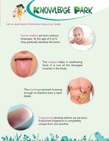 41The tongue helps in swallowing food. It is one of the strongest muscles in the body.Fingerprints develop before we are born. Everyone%u2019s fingerprint is completely unique from one another.The acid in our stomach is strong enough to dissolve even a razor blade.Human babies are born without kneecaps. At the age of 3 to 5, they gradually develop the bone.Let us read some information about our body.