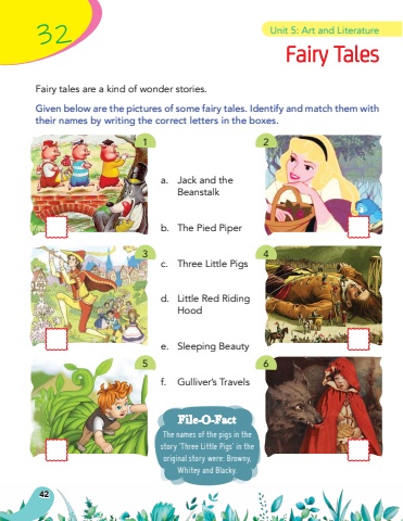 4232Unit 5: Art and LiteratureFairy TalesFairy tales are a kind of wonder stories.Given below are the pictures of some fairy tales. Identify and match them with their names by writing the correct letters in the boxes.a.Jack and the Beanstalkb.The Pied Piperc.Three Little Pigsd.Little Red Riding Hoode.Sleeping Beautyf.Gulliver%u2019s TravelsThe names of the pigs in the story %u2018Three Little Pigs%u2019 in the original story were: Browny, Whitey and Blacky.File-O-Fact135246