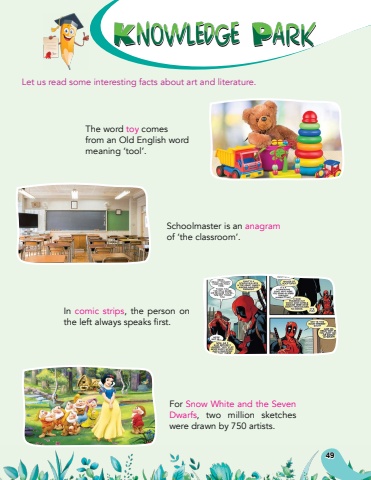 49The word toy comes from an Old English word meaning %u2018tool%u2019.In comic strips, the person on the left always speaks first.For Snow White and the Seven Dwarfs, two million sketches were drawn by 750 artists.Schoolmaster is an anagram of %u2018the classroom%u2019.Let us read some interesting facts about art and literature.