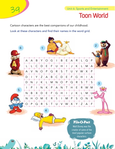 5039Cartoon characters are the best companions of our childhood.Look at these characters and find their names in the word grid.Walt Disney was the creator of some of the most popular cartoon characters.File-O-FactToon WorldUnit 6: Sports and EntertainmentA A B Y O G I B E A R L Q PL L C D E F U H I J K L M AA V N O P Q R S T U V W X PD I Y Z A B C D E F G H I AD N J K L M N O P Q R S T SI P I N K P A N T H E R W MN B X D E F G H I J K L M UN H O M E R S I M P S O N RO P Q R S T U V W X Y Z A F123456