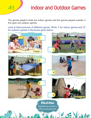 5241The games played inside are indoor games and the games played outside in the open are outdoor games.Look at these pictures of different games. Write %u2018I%u2019 for indoor games and %u2018O%u2019 for outdoor games in the boxes given below.Basketball was invented in 1891 by James Naismith.File-O-FactIndoor and Outdoor GamesChessHockeyTable TennisSquashBaseballBadminton246135