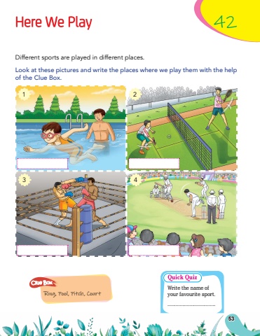 53Here We Play42Different sports are played in different places.Look at these pictures and write the places where we play them with the help of the Clue Box.Ring, Pool, Pitch, CourtClue Box1324Write the name of your favourite sport....................................