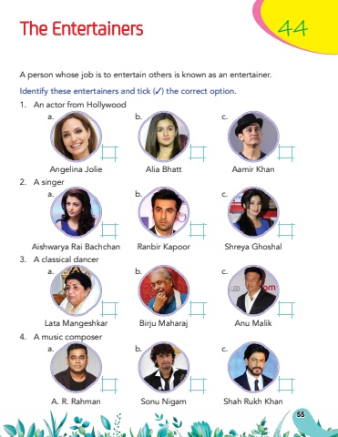 55A person whose job is to entertain others is known as an entertainer.Identify these entertainers and tick (%uf033) the correct option.1.An actor from Hollywooda.b.c.2.A singera.b.c.3.A classical dancera.b.c.4.A music composera.b.c.The Entertainers44Angelina Jolie Alia Bhatt Aamir KhanAishwarya Rai Bachchan Ranbir Kapoor Shreya GhoshalLata Mangeshkar Birju Maharaj Anu MalikA. R. Rahman Sonu Nigam Shah Rukh Khan