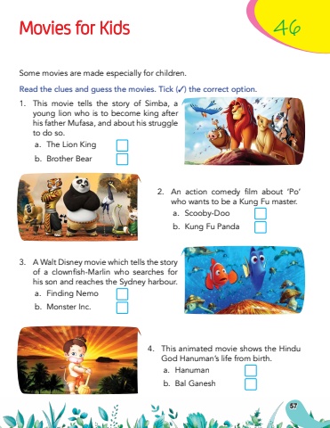 57Some movies are made especially for children.Read the clues and guess the movies. Tick (3) the correct option.Movies for Kids461.This movie tells the story of Simba, a young lion who is to become king after his father Mufasa, and about his struggle to do so.a.The Lion Kingb.Brother Bear2.An action comedy film about %u2018Po%u2019 who wants to be a Kung Fu master.a.Scooby-Doob.Kung Fu Panda3.A Walt Disney movie which tells the story of a clownfish-Marlin who searches for his son and reaches the Sydney harbour.a.Finding Nemob.Monster Inc.4.This animated movie shows the Hindu God Hanuman%u2019s life from birth.a.Hanumanb.Bal Ganesh