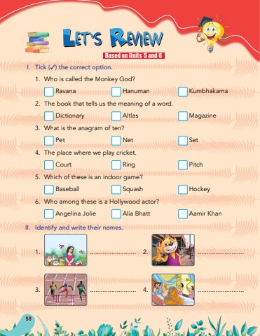 58Based on Units 5 and 6I.Tick (3) the correct option.1.Who is called the Monkey God?RavanaHanumanKumbhakarna2.The book that tells us the meaning of a word.DictionaryAltlasMagazine3.What is the anagram of ten?PetNetSet4.The place where we play cricket.CourtRingPitch5.Which of these is an indoor game?BaseballSquashHockey6.Who among these is a Hollywood actor?Angelina JolieAlia BhattAamir KhanII.Identify and write their names.1...........................2...........................3...........................4...........................