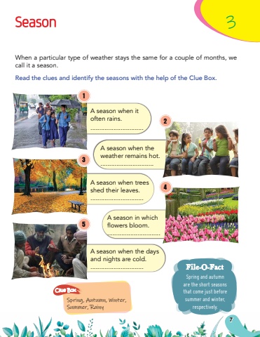 7Spring and autumn are the short seasons that come just before summer and winter, respectively.File-O-FactSeason3When a particular type of weather stays the same for a couple of months, we call it a season.Read the clues and identify the seasons with the help of the Clue Box.A season when it often rains...............................A season when trees shed their leaves. ..............................A season when the days and nights are cold. ..............................A season when the weather remains hot. ..............................A season in which flowers bloom. ..............................Spring, Autumn, Winter, Summer, RainyClue Box13524