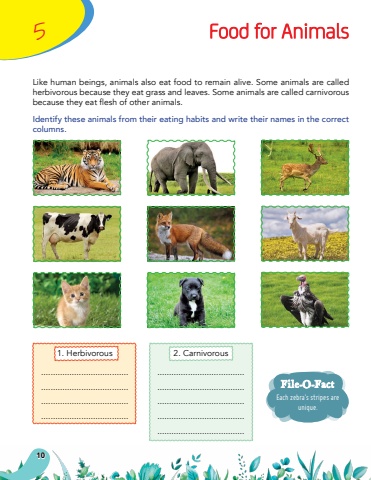 5Each zebra%u2019s stripes are unique.File-O-FactFood for AnimalsLike human beings, animals also eat food to remain alive. Some animals are called herbivorous because they eat grass and leaves. Some animals are called carnivorous because they eat flesh of other animals.Identify these animals from their eating habits and write their names in the correct columns. 1. Herbivorous....................................................................................................................................................2. Carnivorous.........................................................................................................................................................................................10